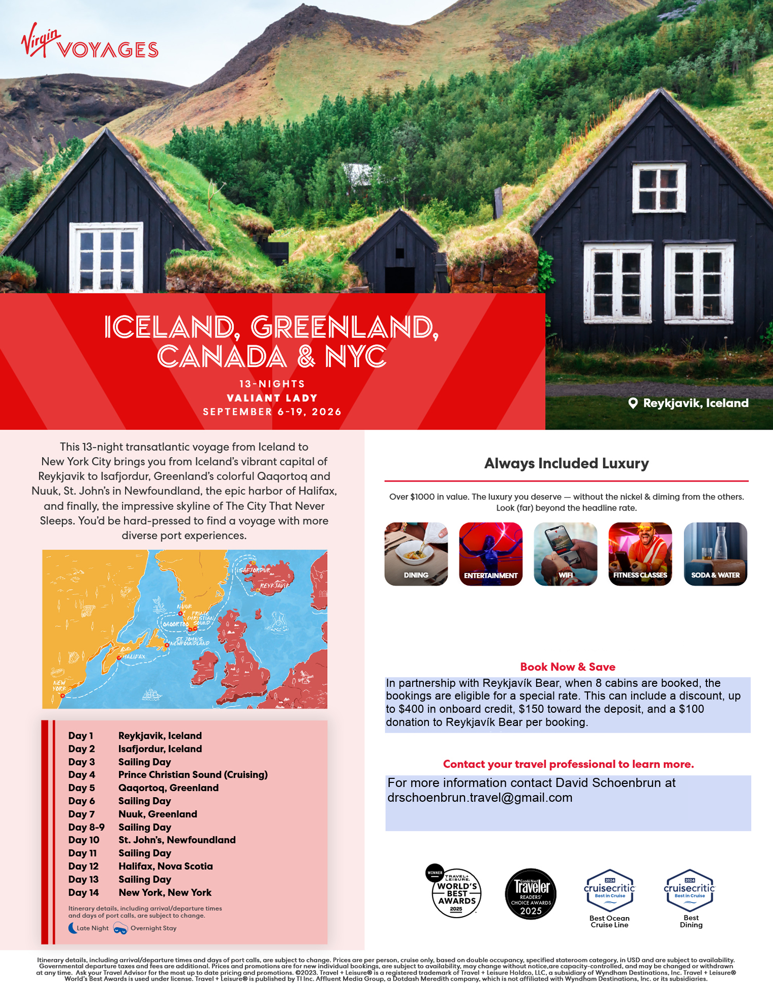 We’re excited to partner with David Shoenbrun —a Top 100 Virgin Voyages travel specialist— to offer an optional post-Reykjavík Bear journey at sea.